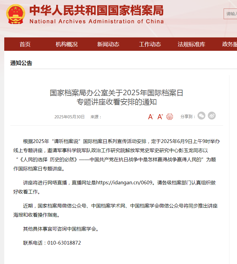 國 家檔案局辦公室關于2025年國際檔案日 專題講座收看安排的通知